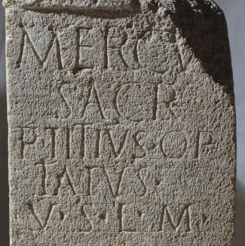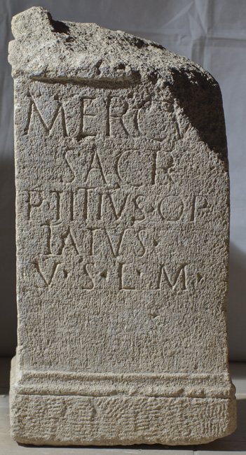- Mercu[r(io)] / sacr(um) / P(ublius) Titius Op/tatus / v(otum) s(olvit) l(ibens) m(erito)