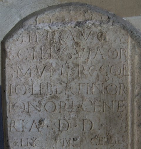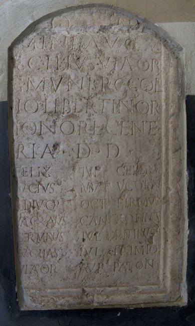 - [I(ovi)] O(ptimo) M(aximo) / [nu]mini Aug(usti) / [L(ucius) C]aecilius Viator / [Au]g(ustalis) mun(icipii) Brig(etionis) col/[leg]io libertinor(um) / [ob] honore(m) cente/[na?]ria d(ono) d(edit) / [---] Felix / [---] Lucius / [---] Adiutor / [---] Viatorianus / [---] Germanus / [---] Eutichas(!) / [---] Viator // Iul(ius) Celer / Mutt(ius?) Victorin(us) / Oct(avius) Firmus / Catin(ius) Trofimus / Iul(ius) Lentinus / Iul(ius) Primio / Aur(elius) Patroin(us)
