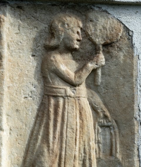 - Dienerin: einheimisches Mädchen mit kurzerm Haar, Unter- und Obergewand, Gürtel, in der Rechten Spiegel, in der Linken mappa. Links Feld mit Krater und Spiralranken.