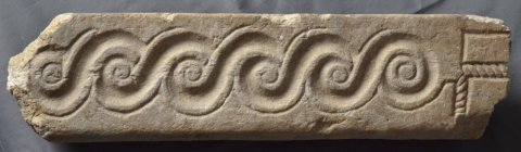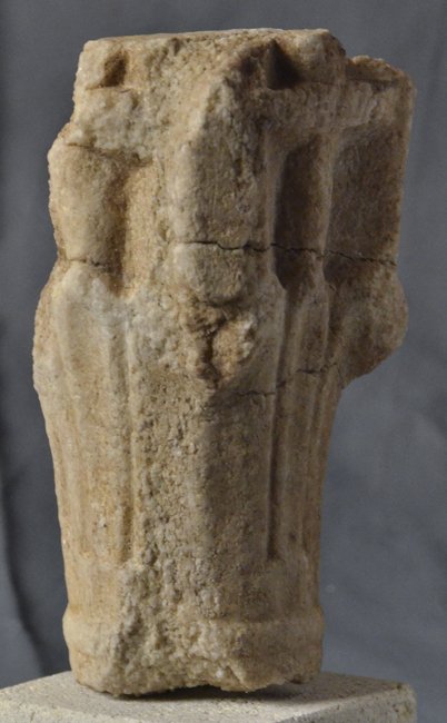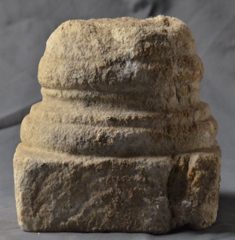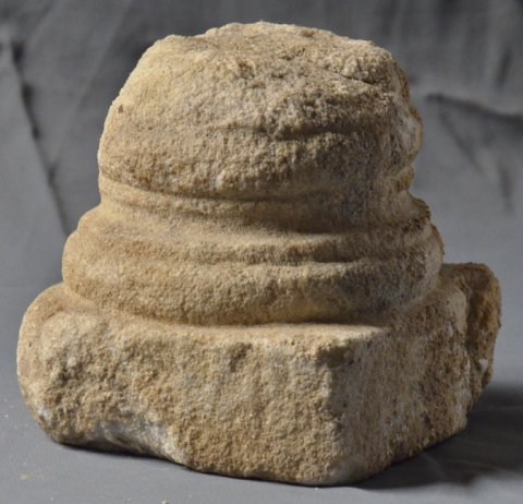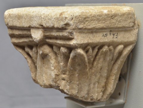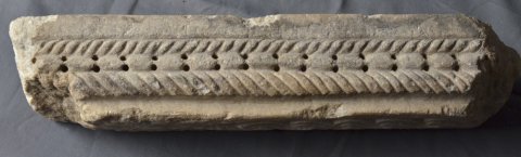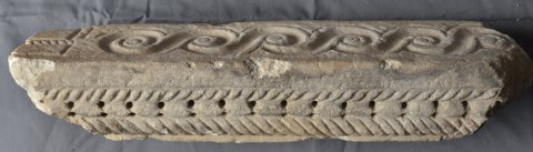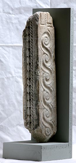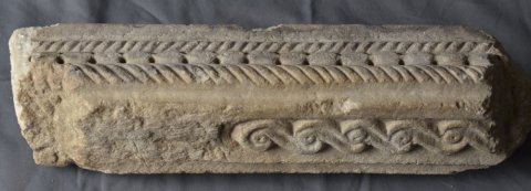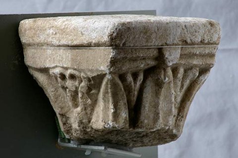 - Zwei unterschiedliche Blattkapitelle, eine profilierte Basis und Teil eines dreiseitig ornamentierten Balkens. Auf einer Seite Perlstab zwischen zwei tordierten Rundstäben, auf der zweiten liegende Spiralhaken (laufender Hund), auf der dritten einfaches Flechtband. Teile von Chorschranken.