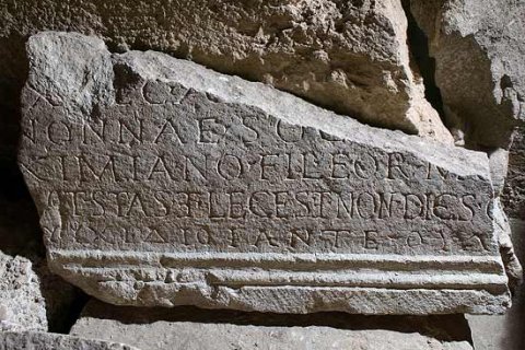- D(is) [M(anibus)] // [et] memori[ae ---] / [---] coniug[is ---] / [du]lcissim[ae ---] / [---]XIIII C(aius) Iu[---]/[--- c]onta[riorum? ---?] / [e]t Di[---] // [---] X[---]LCA[---] / [---] Nonnae soc[rui ---] / [--- Ma]ximiano fil(io) eorumq[ue] / [---]vit stas et leges et non dices Q[---] / griechisch: [--- εὐ]ψύχ(ε)ι Διόφαντε οὐδ[εὶς ἀθάνατος]