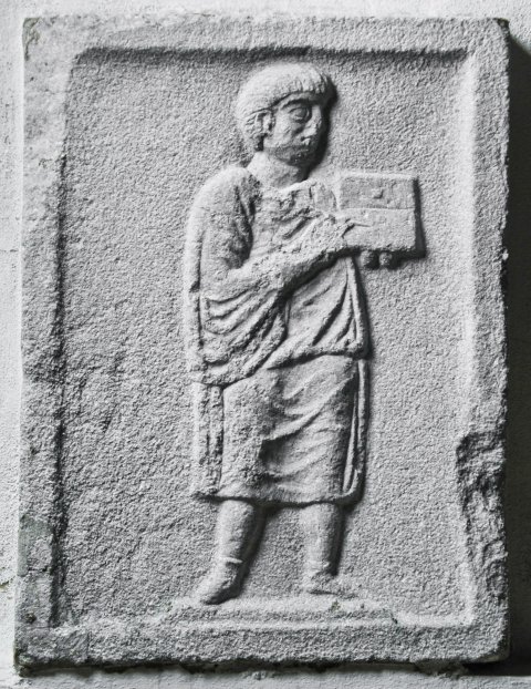 - Einfach gerahmtes Rechteckfeld. Librarius - Scriba mit kurzer Ärmeltunica und Schuhen, schreibt mit Stilus in Diptychon.