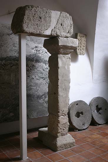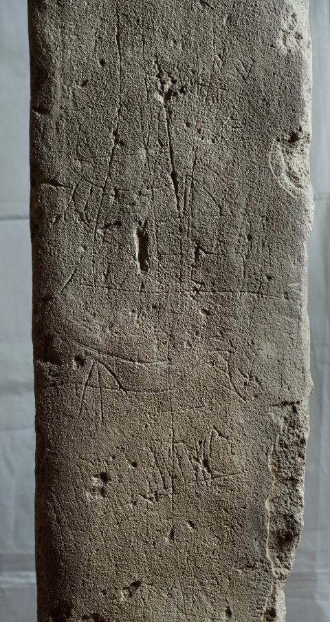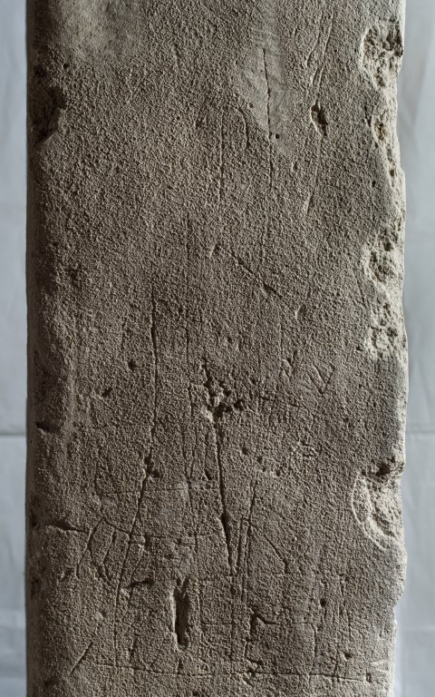 - Vierkaniger Pfeiler mit kubischem Sockel und einfach profiliertem vierseitigem Kapitell. Oberfläche mit Stuckschicht überzogen, darin Ritzzeichnungen (Tiere, Hirsche ?). Der Inschriftblock Nr. 1878 lag über den Pfeilern.