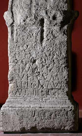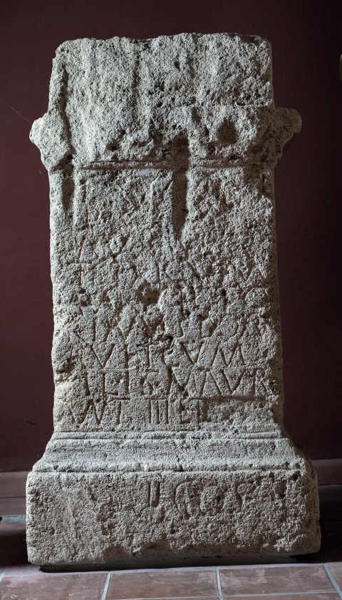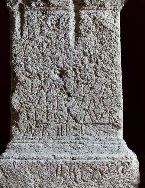 - I(ovi) o(ptimo) m(aximo) / [ pro salute ] / Augus/torum / Aur(elius) Victo/rinus don/avit cum / fili(is) M(arco) Aur(elio) / Ant(onino) III et Geta // II co(n)s(ulibus)