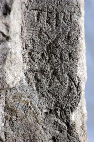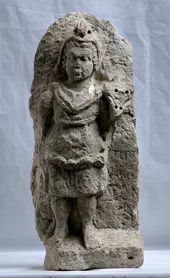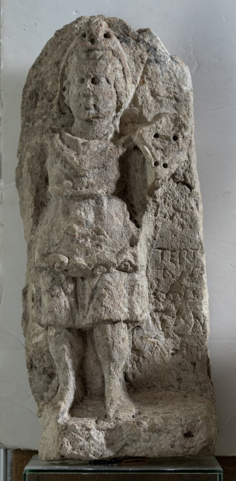 - Mythische Figur: Nemesis ? Virtus ? Rahmenlose Platte mit vorspringender Standleiste. Stehende Figur in kurzer Tunica mit Überschlag und Gürtel, Sagum und phrygischer Mütze (darin Löcher für Metallappliken ?), an der linken Schulter Vexillum (?), ebenfalls mit Löchern für Metallverzierungen ?. Inschrift neben dem linken Bein sekundär.