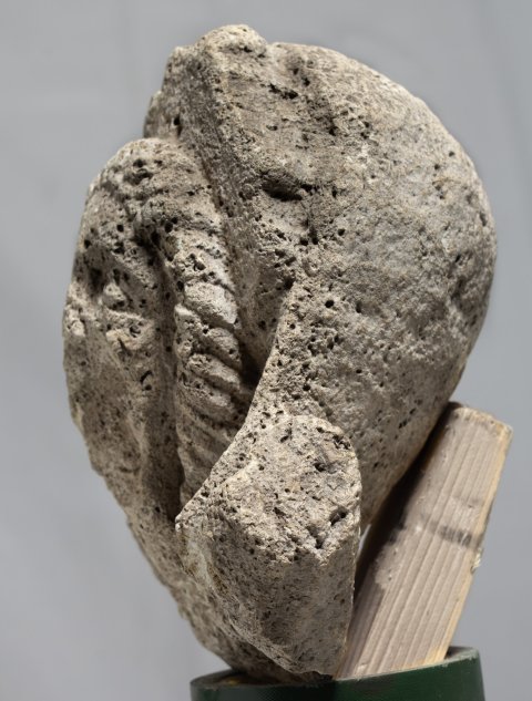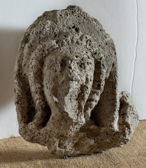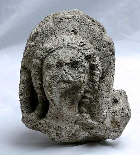 - Mythische Figur (Göttin, Juno ?): Weiblicher Kopf mit hohem Diadem und Schleier.