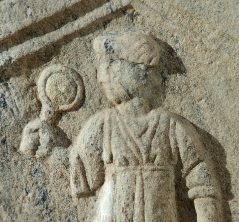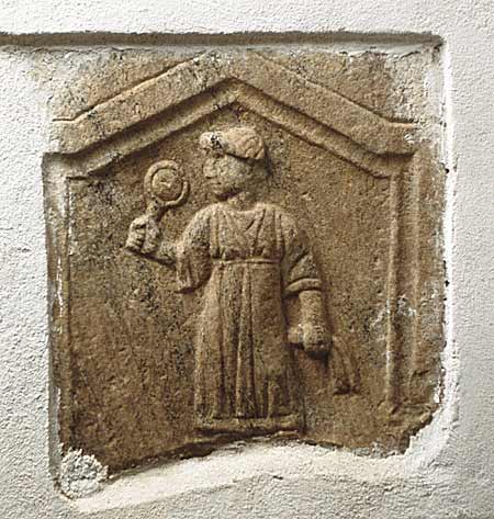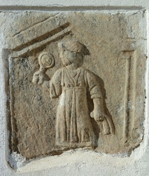 - Dienerin: unter Giebel auf niedrigem Podest einheimisches Mädchen mit Unter- und Obergewand, Gürtel, in der Rechten Spiegel, in der Linken mappa.