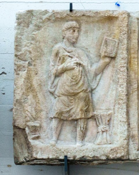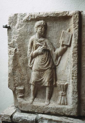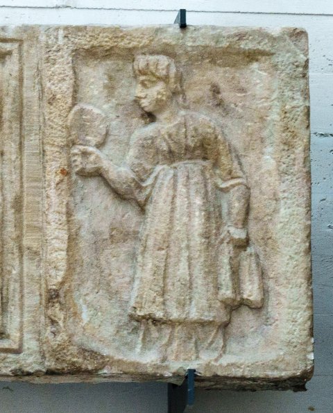 - Diener, Dienerin. Linkes Seitenfeld: Librarius - Scriba: kurze Tunica, in der Rechten Stilus, in der Linken Schreibtafel. Tintenfaß neben dem rechten, Rollenbündel neben dem linken Fuß. Rechtes Seitenfeld: Dienerin: kurzes Haar, langärmeliges Untergewand, gegürtetes Obergewand, in der Rechten Spiegel, in der Linken Tuch (mappa).