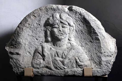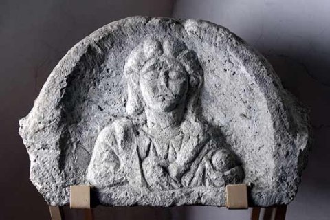 - Halbrundes, einfach gerahmtes Bildfeld mit Brustbild einer Frau mit severischer Frisur, in Tunica und Mantel. Akroter eines Sarkophagdeckels.
