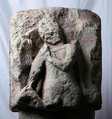- unten abgebr., stark bestoßen, auf der Rückseite rechts vorspringende Leiste