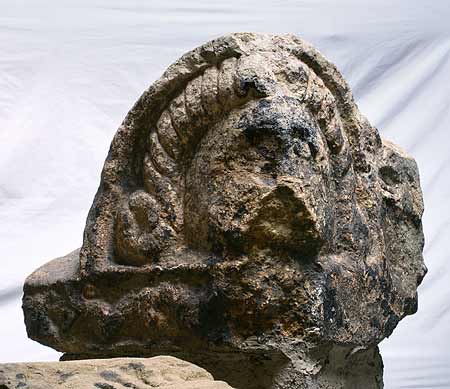 - Weibliche tragische Maske ? Eckakroter eineds Sarkophagdeckels.