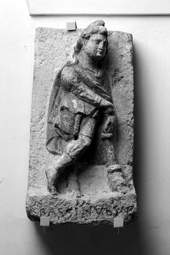 - Mythische Figur : ungerahmte Platte mit vorspringender Standleiste (auf deren Vorderseite die Inschrift). Mit gekreuzten Beinen stehender Cautopates in Hosen, kurzer Tunica, Mantel und phrygischer Mütze, stützt sich mit beiden Händen auf gesenkte Fackel.