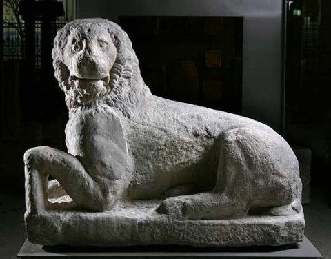 - auf flacher Basisplatte nach links hin liegender Löwe, Kopf herausgedreht, unter den Vorderpranken Pferdekopf.