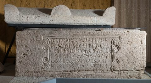 - D(is) M(anibus) // aeternae quieti per/petuae securitati / ob memoriam Aureliae / Carae quae vixit ann(os) / XXXIIII Aurilius (!) Sabi/nus tess(erarius) coniugi bene/merenti f(aciendum) c(uravit)