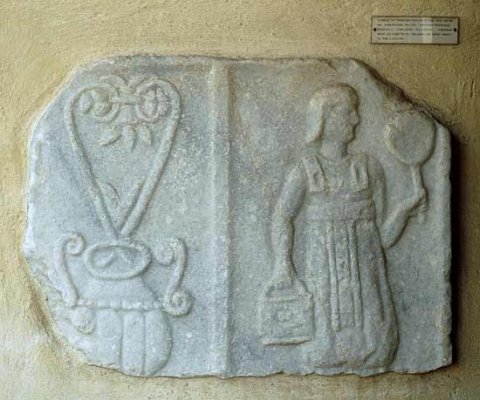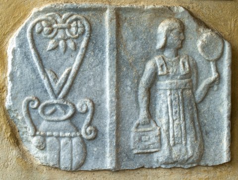 - Dienerin: einheimisches Mädchen mit Unter- und Obergewand, Fibeln, Gürtel, in der Rechten Eimer(Tasche ?), in der Linken Spiegel. Links Feld mit Krater und Palmettenranke