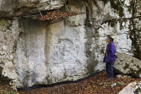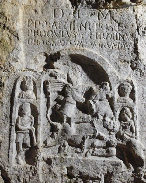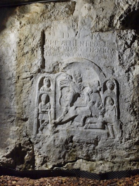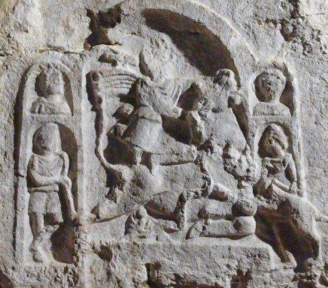 - Mythos (Mithras): unterhalb der Inschrift rundbogig gerahmtes Bildfeld mit Stiertötung (Tauroktonie), flankiert von Cautes und Cautopates, über diesen Bogennischen mit Büsten von Sol und Luna.