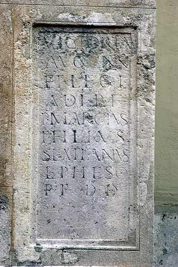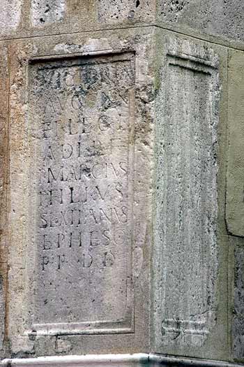 - Victoriae / Augg(ustorum) nn(ostrorum) / et leg(ionis) I / adi(utricis) p(iae) f(idelis) / Antoninianae / P(ublius) Marcius / P(ubli) filius / Sextianus / Epheso / p(ecunia) p(ublica) d(ecreto) d(ecurionum) // dedicante / Egnatio / Victore / leg(ato) Augg(ustorum) / pr(o) pr(aetore) / et Cl(audio) / Pisone / legato / leg(ionis) / V Idus / Iunias / Apro et / Maximo / co(n)s(ulibus)
