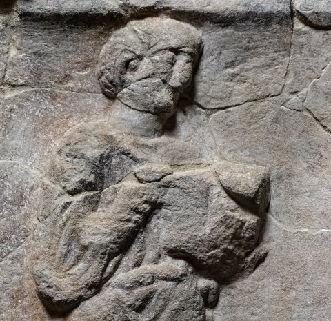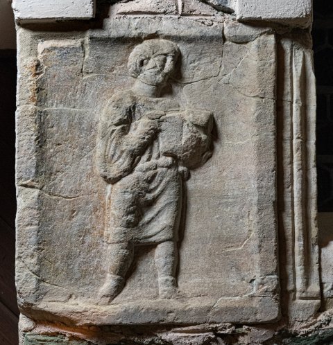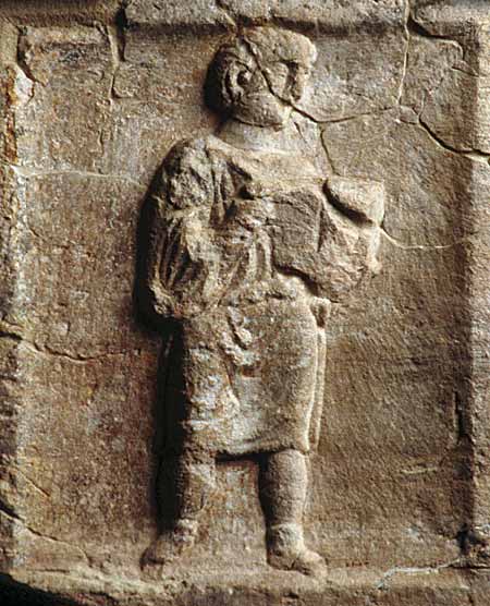 - Diener (Librarius - Scriba): in Rechtecknische Mann in kurzer Tunica, schreibt mit Stilus in Diptychon. Rechts Ansatz des Mittelfeldes erhalten.