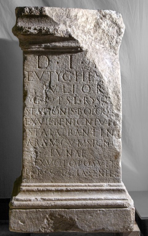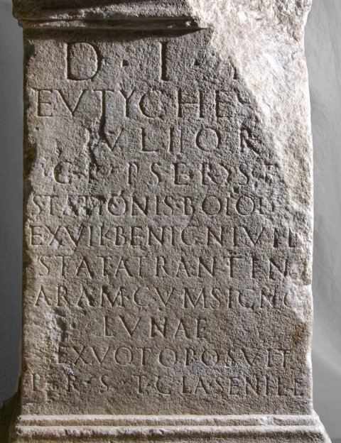 - D(eo) i(nvicto) M(ithrae) / Eutyches / Iulior(um) / c(onductorum) p(ortorii) p(ublici ?) ser(vus) c(ontra)s(crip)t(or ?) / stationis Boiod[u(rensis) ] / ex vik(ario) Benigni vil(ici) / stat(ionis) Atrantin(ae) / aram cum signo / Lunae / ex voto posuit / pr(o)s(edente) T(ito) Cla(udio) Senill(o)