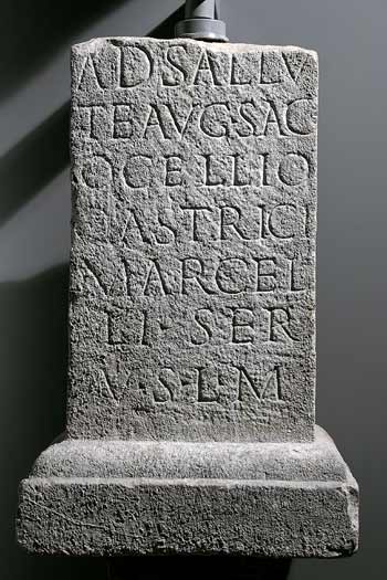 - Adsallu/t(a)e Aug(ustae) sac(rum) / Ocellio / Castrici / Marcel/li ser(vus) / v(otum) s(olvit) l(ibens) m(erito)