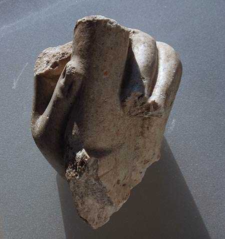 - Lebensgroße Hand, die das Ende eines zylindrischen Objekts (Schwertgriff ?) umfasst. Rest einer Götterstatue ?