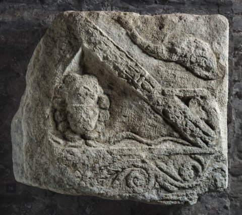 - Eingeschriebener Giebel, Rahmen mit Perlstab. Im Giebelfeld Gorgoneion, über den Schrägen Delphine, auf der Rahmenleiste unten Ranke.