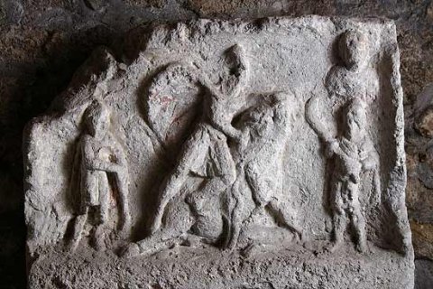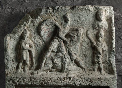 - Mythos (Mithras) : in einfach gerahmtem Rechteckfeld Stiertötung (Tauroktonie), flankiert von Cautes und Cautopates, über diesen Büsten von Luna und Sol (dieser weggebrochen).