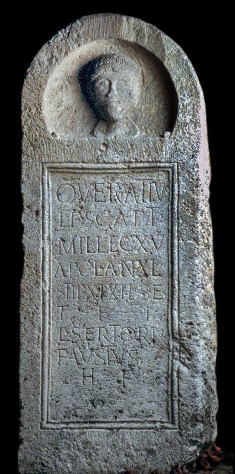 - Q(uintus) Veratius / L(uci) f(ilius) Scapt(ia) / mil(es) leg(ionis) XV / Apol(linaris) an(norum) XL / stip(endiorum) XIX h(ic) s(itus) e(st) / t(estamento) f(ieri) i(ussit) / L(ucius) Sertorius / Faustus / h(eres) f(ecit)