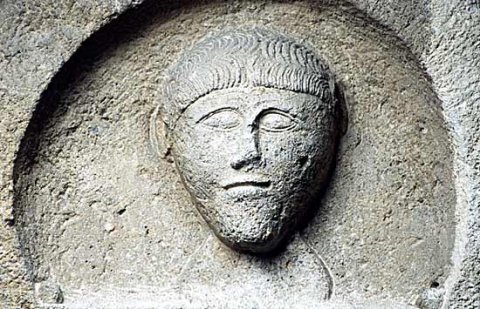 - In Bogennische Büste eines Mannes: bartlos, gesträhntes Haar.