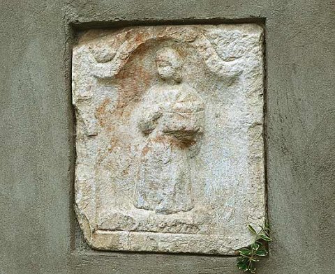 - Dienerin: in Bogennische auf flachem Podest einheimisches Mädchen mit kurzem Haar und langem Ärmelgewand, in den Händen Kästchen.