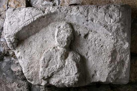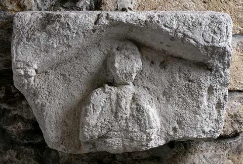 - Nische mit flachem Giebel, seitlich Reste von Kapitellen von Säulen oder Pilastern. Frontal stehende Ganzfigur (?) einer einheimischen (?) Frau, auf der rechten Schulter Fibel (?).