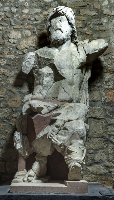 - Mythische Figur : Kolossalstatue des thronenden Jupiter mit Eichenlaubkranz mit Tänien, Mantel um Unterkörper und linke Schulter, Sandalen. Rechter Arm gesenkt, linker erhoben. Thron mit Sitzkissen und fransenbesetzter Decke belegt, ohne Rückenlehne, flache Thronbeine mit Volutenenden.