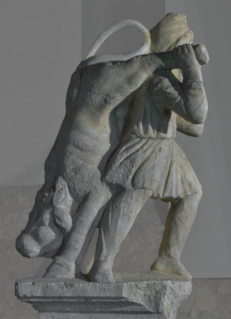 - Mythos : Auf vierkantigem Sockel mit profilierter Deckplatte und Weihinschrift stiertragender Mithras in weiter Schrittstellung.