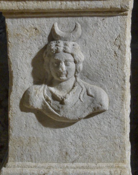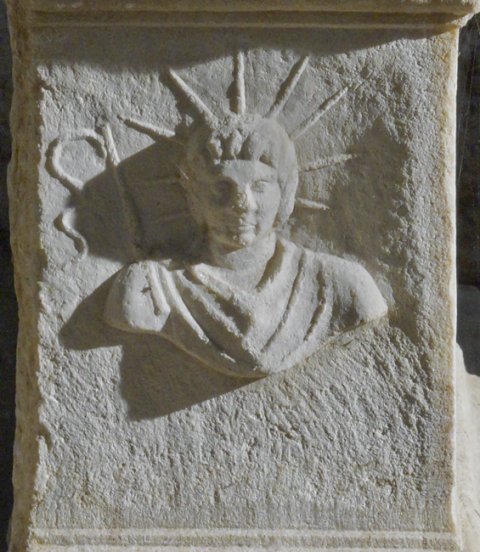 - Mythos : auf dem Altar rundplastische Darstellung der Felsgeburt (petra genetrix) des Mithras (nur Fels erhalten, darin oben Dübelloch). Auf dem Altarschaft links Büste des Sol mit Strahlenkranz und Peitsche, rechts Büste der Luna mit Mondsichel auf dem Scheitel. Schriftfeld mit profiliertem Rahmen.