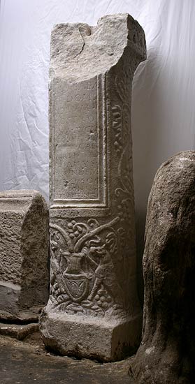 - Säulenförmige Basis mit niedrigem kubischen Sockel, darüber Krater mit Weinranken zwischen sitzenden Panthern. Die Weinranken flankieren auch das hochrechteckige, profiliert gerahmte Schriftfeld.