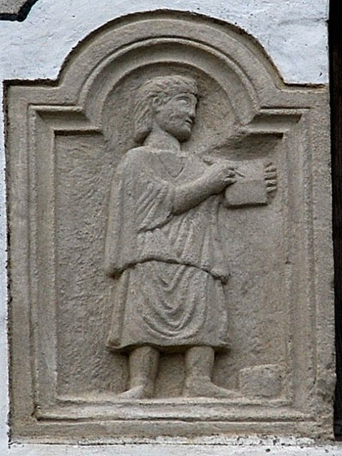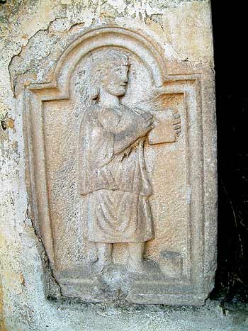 - Diener (Librarius - Scriba): in Bogenfeld Mann in kurzer Tunica, schreibt mit Stilus in Diptychon. Neben dem linken Fuß Rollenbehälter.