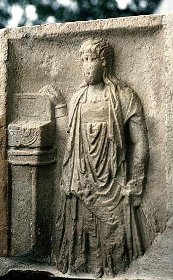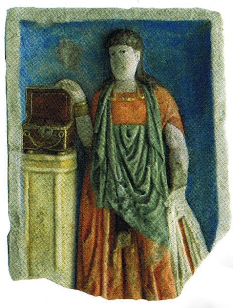 - Dienerin: einheimisches Mädchen mit offenem Haar, Umhang, Ober- und Untergewand, Brustschmuck, Armband. Links hohes Postament, darauf Kästchen mit offenem Deckel. Am linken Rand Rahmen eines anschließenden Feldes sichtbar.