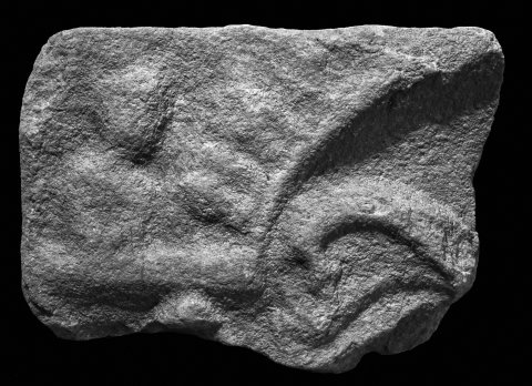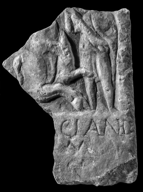 - Mythos (Mithras): Einfach gerahmtes Bildfeld mit Darstellung der Stiertötung (Tauroktonie), (erhalten nur Vorderteil des Stiers und Cautes).