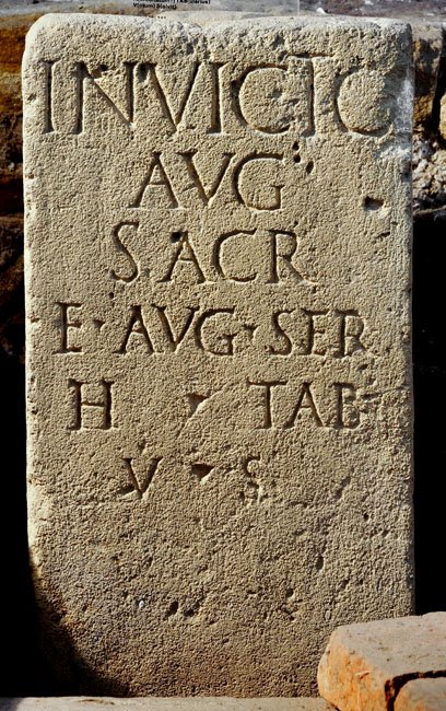- Invicto / Aug(usto) sacr(um) / E() Aug(usti) ser(vus) / h(ereditatum?) tab(ularius) / v(otum) s(olvit)