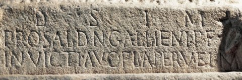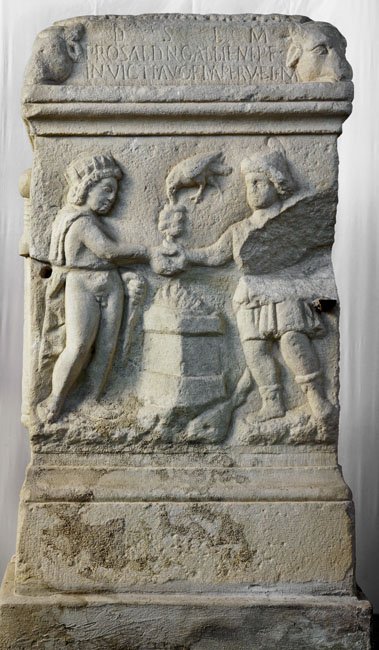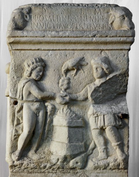 - D(eo) S(oli) i(nvicto) M(ithrae) / pro sal(ute) D(omini) n(ostri) Gallieni p(ii) f(elicis) / invicti Aug(usti) Fl(avius) Aper v(ir) e(gregius) l(ibens) m(erito)