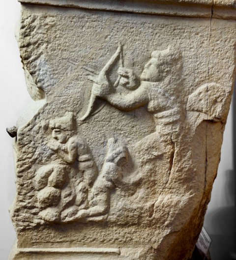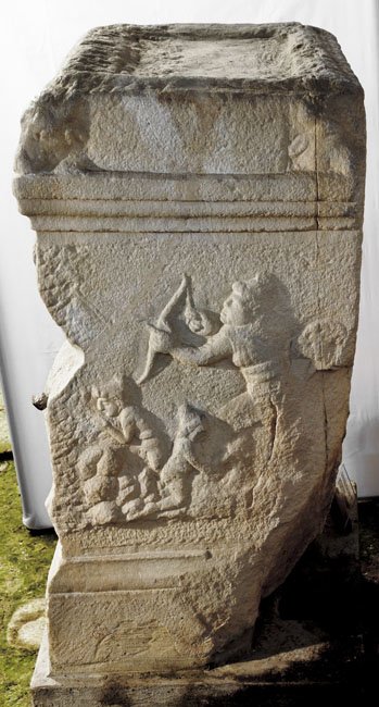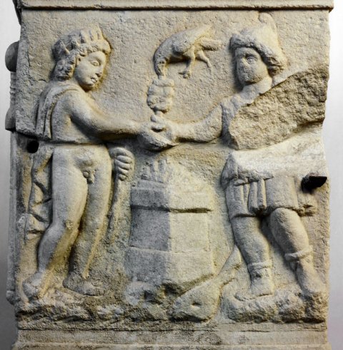 Mythos. Auf der Vorderseite: Sol und Mithras reichen sich über einem Altar die Hände, zu Füßen des Mithras Teil des getöteten Stiers, in der rechten Hand des Mithras Dolch mit Fleischstück, von dem der Rabe frisst. Über der profilierten Deckplatte Aufsatz mit Stierköpfen an den vier Ecken, auf der Vorderseite Weihinschrift.