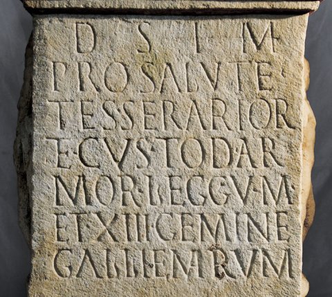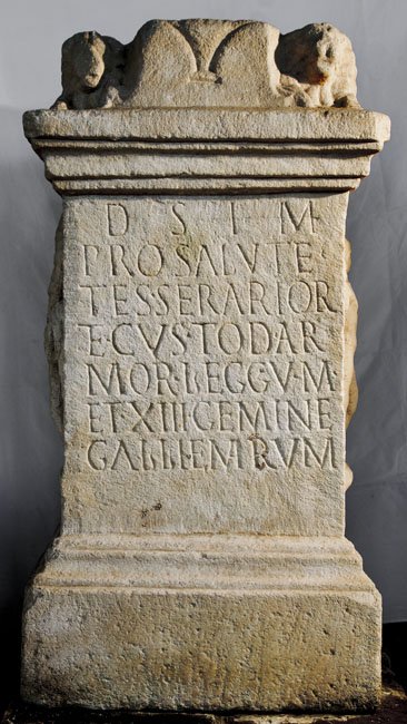 - D(eo) S(oli) i(nvicto) M(ithrae) / pro salute / tesserarior(um) / et custod(um) ar/mor(um) leg(ionum) V M(acedonicae) / et XIII gemin(a)e / Gallienarum