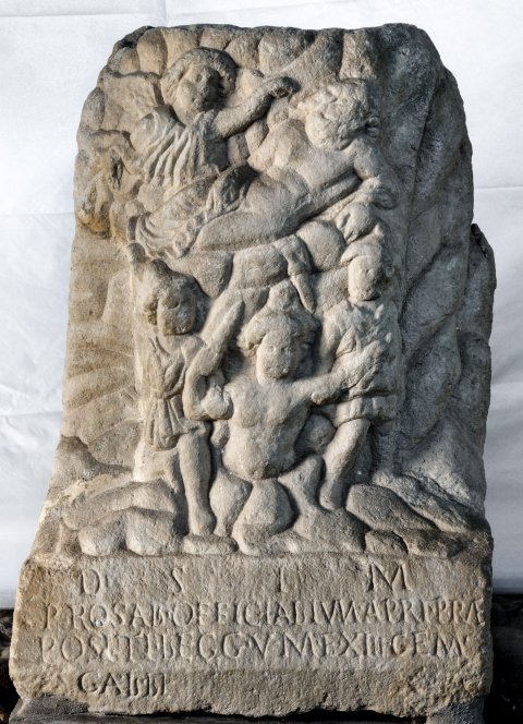 - Mythos : Eckiger, vorn abgeschrägter Sockel mit Weihinschrift, darüber Felsgeburt des Mithras (petra genetrix), assistiert von zwei Jünglingen in orientalischer Tracht (Cautes, Cautopates). Mithras hält in der Rechten den Dolch, in der Linken die Fackel. Oberhalb von Mithras gelagerter bärtiger Gott und fliegende Victoria.