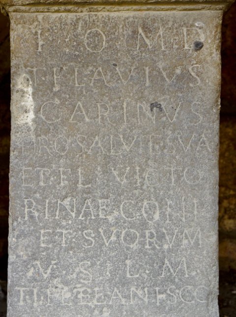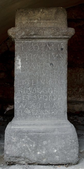 - I(ovi) O(ptimo) M(aximo) D(olicheno) / T(itus) Flavius / Carinus / pro salute sua / et Fl(aviae) Victo/rinae coni(ugis) / et suorum / v(otum) s(olvit) l(ibens) m(erito) / II [Si]lanis co(n)s(ulibus)