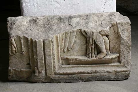 - Mythos : gerahmtes Bildfeld (rechtes Seitenfeld) mit Beinen der Leda und Resten des Schwans? Links weiteres gerahmtes Feld mit Reliefrest.