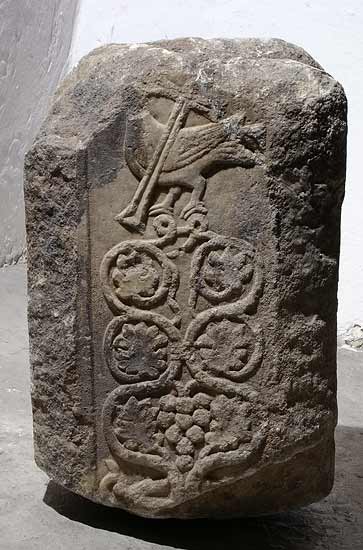 - Links schmale Rahmenleiste. Zwei zusammengebundene Weinranken mit Traube, darüber stehender Vogel, schräg über dessen Körper ein Kreuz.