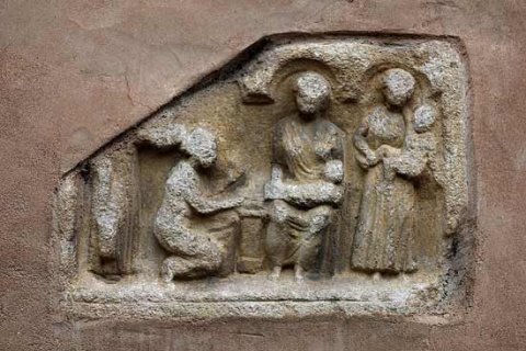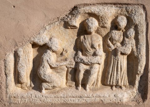 - Mythische Figur : einfach gerahmtes Bildfeld, oben vier Bögen. Frontal thronende Nutrix mit Wickelkind auf dem Schoß unter dem zweiten Bogen von rechts. Ganz rechts stehende Frau mit Kleinkind auf dem linken Arm. Neben dem rechten Bein der Nutrix Altar, links von diesem kniende Frau, ganz links stehende Frau mit Laterne (?) in der Rechten und Schale (?) in der Linken.