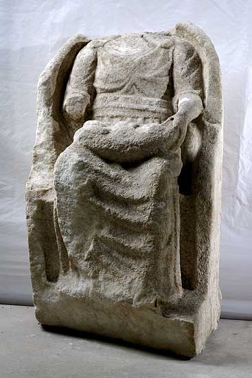 - Mythische Figur (Göttin) : Auf einem Thron mit Rückenlehne sitzende Frau im gegürteten Kleid mit Brustschmuck und Mantel. Im Schoß Korb mit Früchten.
