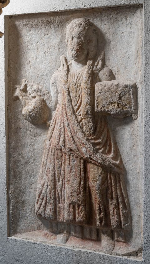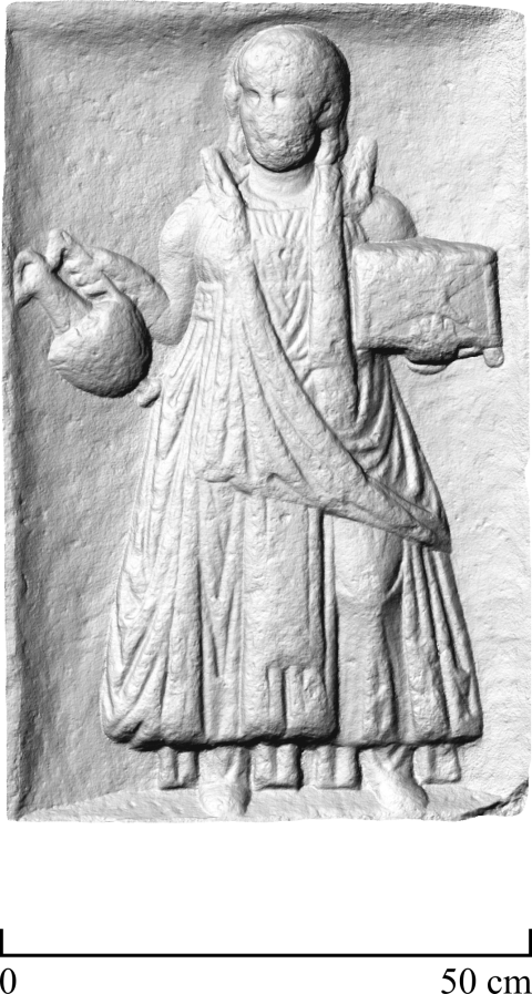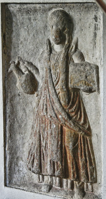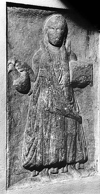 - Dienerin: in Rechtecknische einheimisches Mädchen in Ober- und Untergewand, Gürtel, Fibeln, in der Rechten Kanne mit Kleeblattmündung, in der Linken Kästchen, über der linken Schulter mappa.