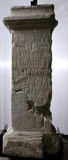 - D(eo) S(oli) I(nvicto) M(ithrae) / num(ini) sanct(o) / et praest(antissimo) / L(ucius) Vander(ius?) / v(otum) s(olvit) l(ibens) m(erito) / [---] Kal(endas) Novem(bres) / Severo et Quint(iano) / p(atre?) p(rosedente?) SII[---]
